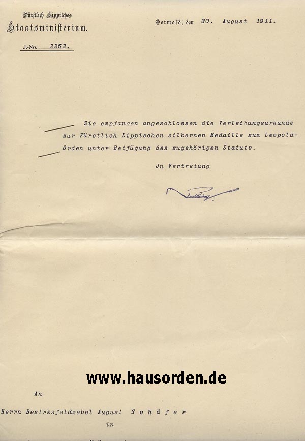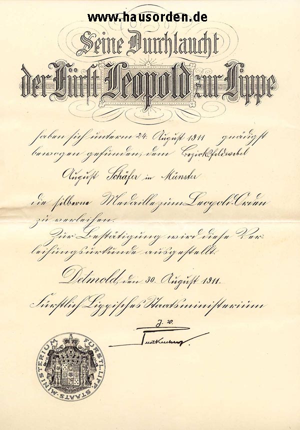 Normalerweise wurden die Urkunden zum Leopold-Orden ausschließlich durch Fürst Leopold IV. selbst unterschrieben.